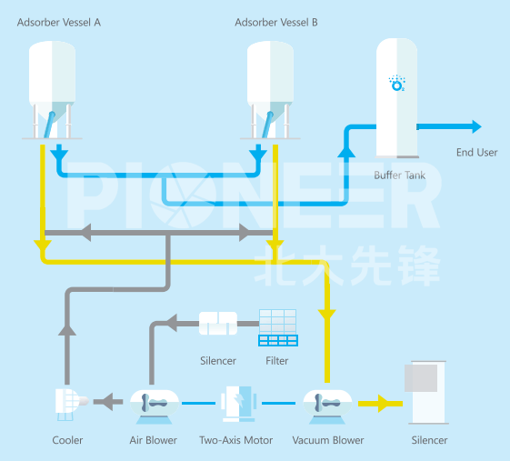 Adsorption: Air passes through the adsorber bed, where nitrogen is adsorbed. Once the adsorber reaches a certain pressure, the product oxygen flows into the oxygen buffer tank.